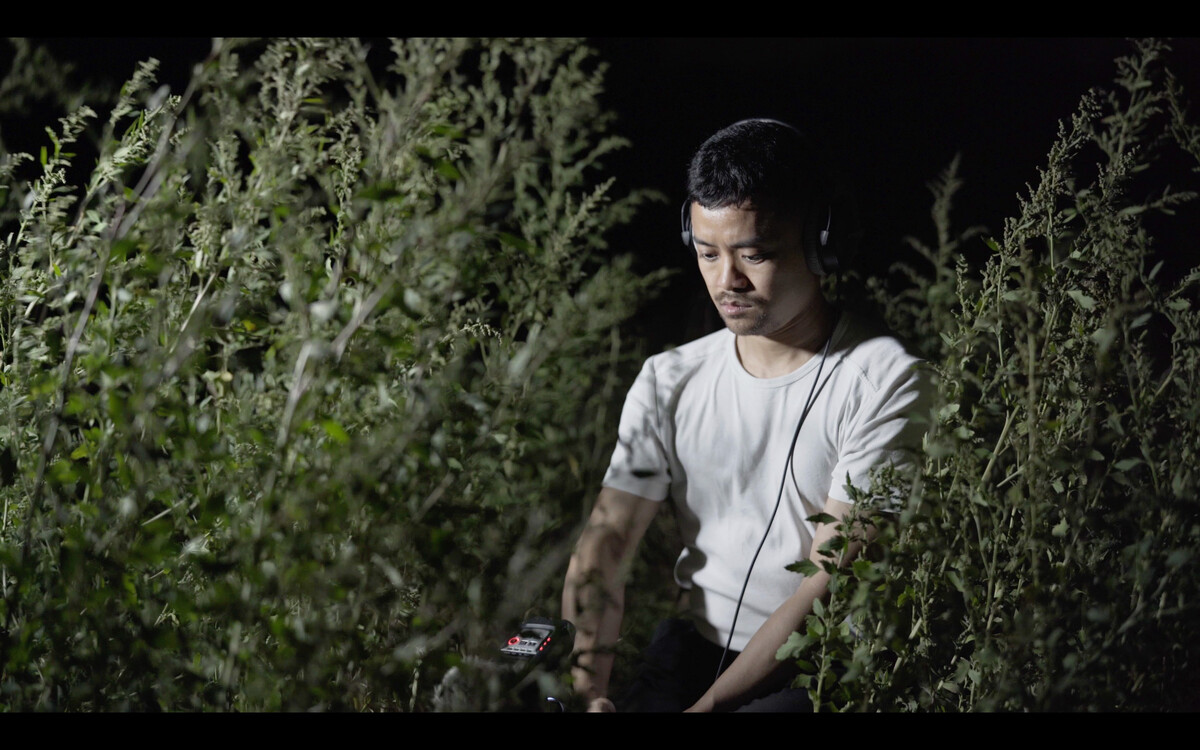 In the video, the artist searches for the pure insect sounds of his childhood, only to find that much has changed. His kinetic sculptures—anthropomorphic insects—add a heavy, imposing presence, symbolizing the exhaustion imposed on these creatures and their environment by human activity. A sound database, compiled during his field recordings, documents the seemingly endless search for undisturbed natural sounds.